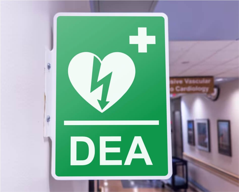 Señalización para zonas cardioprotegidas con diseño en L, impresa por ambos lados, lo que favorece su visualización. Fabricado en acero. Incluye la palabra ‘DEA’ y el símbolo internacional de desfibrilación (corazón con rayo), impresos en blanco sobre fondo verde, garantizando alta visibilidad. Según la normativa vigente, es obligatorio señalizar los desfibriladores externos automáticos (DEA) para facilitar su rápida localización en caso de emergencia.